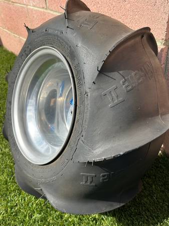 Rear: 20x11x10 Sand Skate 2 on Douglas .125 aluminum rims. Front: 22x8x10 GBC Tracker on Douglas .125 aluminum rims. One wheel is slightly bent but no air leaks and wheels perfectly straight....