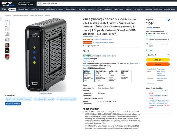 Arris / Motorola "Surfboard" SB8200 Docsis 3.1. Most popular Cable Modem of all time because they are solid and dependable. Regularly $169 selling for $50. Works perfectly and in perfect condition.