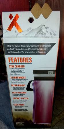 Functions as a water bottle, solar-powered lamp, emergency light, solar charger for your cell phone & other