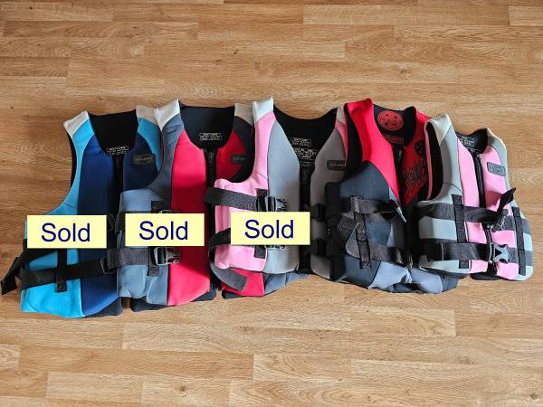 ⚠️ Two vests available ⚠️ Maui and Sons, Red / Black, Adult, X-Small / Small, chest 30-36 inches, over 90 lbs. Stearns, Pink / Grey, Youth, chest 26-29 inches, 50-90 lbs. 💲 CASH ONLY 💲 🚘YOU PICK UP 🚗
