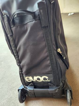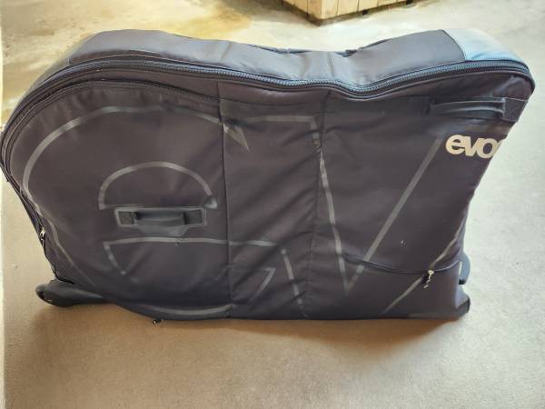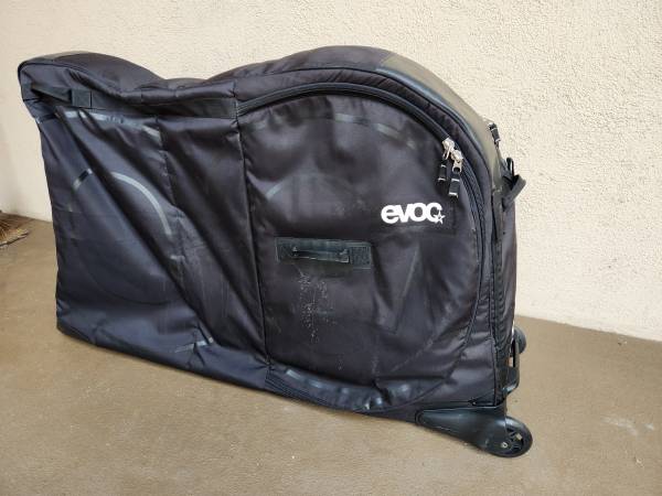 EVOC brand of soft travel case for packing a bicycle to protect while shipping. On wheels which roll perfectly. Save about $450.00 on this item over new price.. All zips tested working. Asking now...