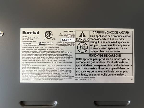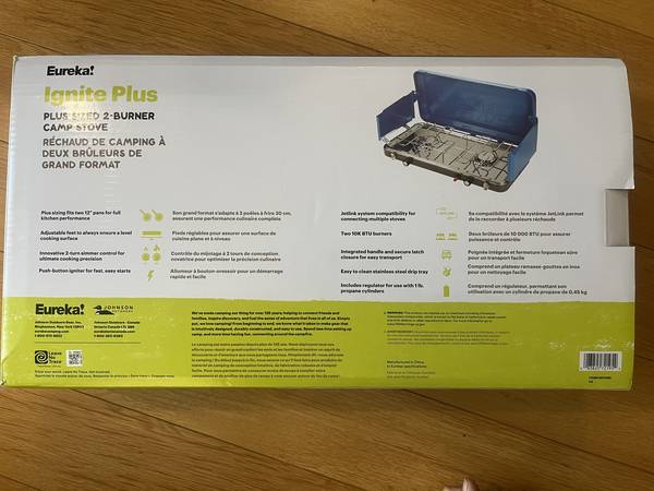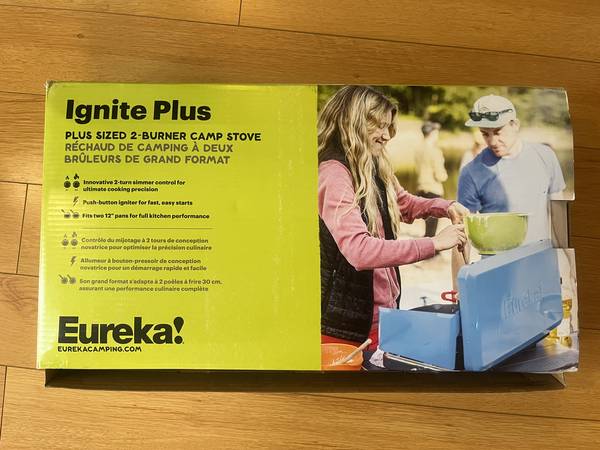 Eureka Ignite Plus, 2-burner Camp Stove $100, cash only. Price Firm. Never used. No scratches and brand new. It fits two 12" pans.