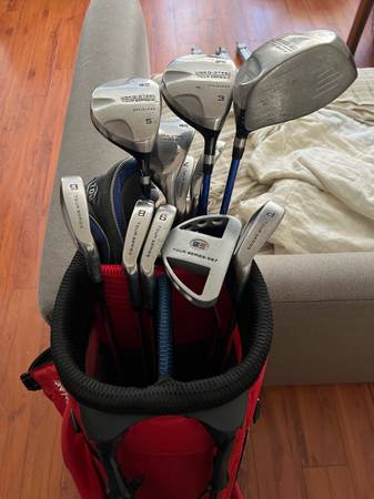 US kids golf clubs for sale. Great condition. Includes bag. 5,6,7,8,9,P plus some woods and a driver.