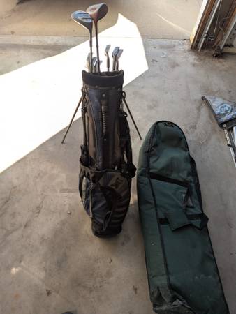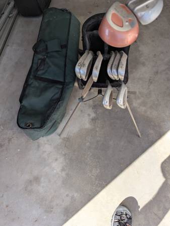 Golf Clubs with Bag and Travel bag. Good condition. Need cleaned. Includes 4.5.6.7.8.9.SW.PW, Putter, Driver, 3 Wood. All aluminum or graphite. Made for someone who is 6'2". Bag is 38" x 10" x 10" ....