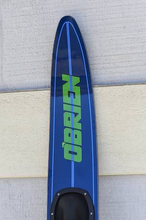 Vintage O'Brien Astral slalom water ski for sale. Graphite composite material construction for better strength and stiffness properties. 174 cm/ 68.5 inch length ideal for stability and quick turns. Ski is suitable for intermediate-level skiers and advanced beginners. Ski was only used 2 or 3 times and is in like-new/excellent condition. Front boot can be adjusted for different foot sizes. Rubber is in good condition with no rips or tears. Small superficial scuffs in a couple of places on bottom surface of ski. No rust on any of the screws. Comes with cover shown in the last two images.