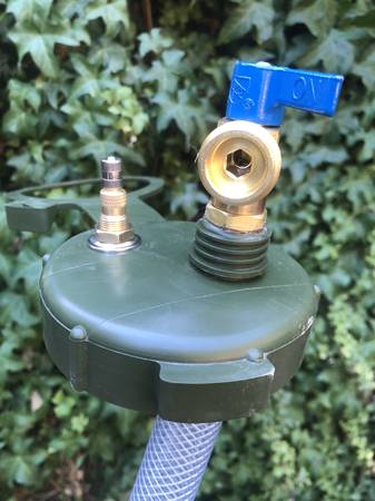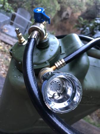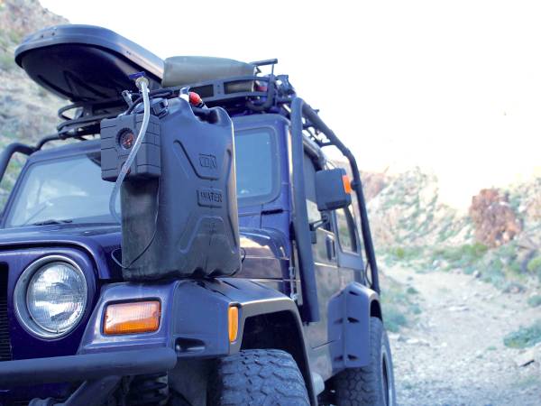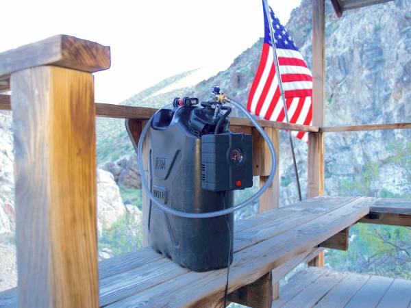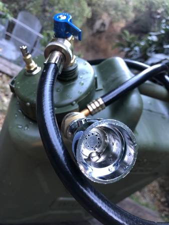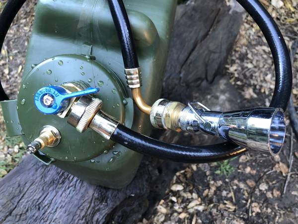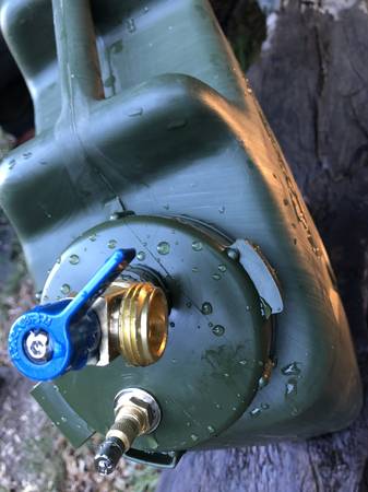 Military Jerry Can made for water. Converted to a pressurized backcountry shower and water system for cleaning dishes, gear or rigs.