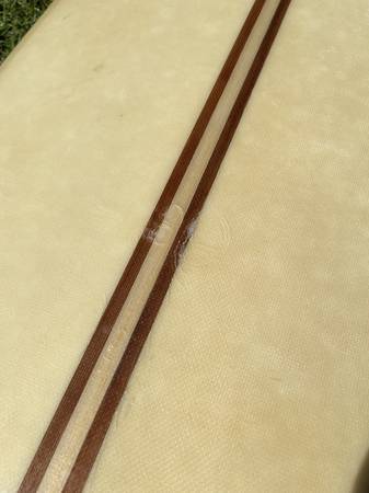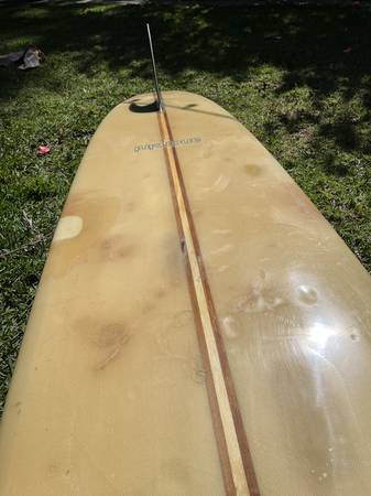 Owl Surfboards, established in 1962 by Jeff White and Brian Bradley, became known for their commitment to quality and craftsmanship. These boards are celebrated not just for their performance but also for their role in the surfing community, often serving as a bridge between the classic and modern eras of surfing. This particular board, featuring a glass-on fin and cedar and redwood triple stringer, adds to its vintage appeal while enhancing its performance characteristics—typical of the classic longboards that made Owl a beloved name among surfers.
