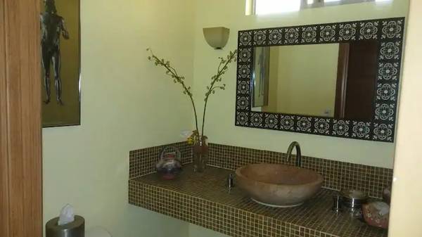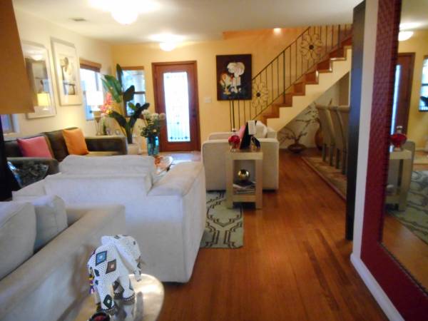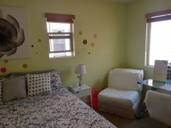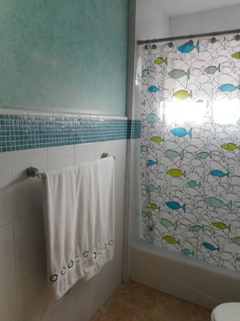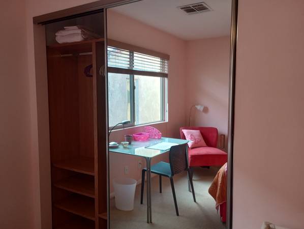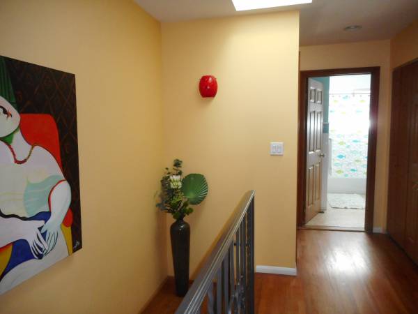 Boarders of the two private rooms will share the white and turquoise bathroom in the photo. You can also use the downstairs living/dining areas, the kitchen for "light" cooking and the laundry facilities (upstairs). The rooms have ceiling light/fan fixtures and the townhouse has central a/c and heat. The bedroom have a berber type carpet. The bathrooms, entryway and kitchens have travertine and all other floors and stairs are redwood.