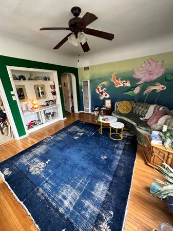 • Hand-painted wraparound koi-pond wall mural in the living room