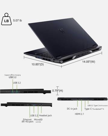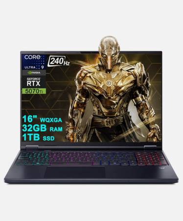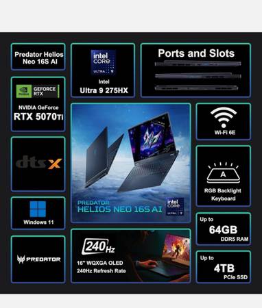 The Acer Predator Helios Neo 16S AI (Model PHN16S-71-98RF, Part NX.U0KAA.001) is a powerful 16″ gaming and creator laptop built for high-performance demands. Engineered around the Intel Core Ultra 9 275HX processor—featuring 8 performance and 16 efficiency cores (24 total threads)—it balances raw power with intelligent efficiency. Paired with 32 GB DDR5-6400 RAM and 1 TB PCIe 4.0 SSD, it provides rapid responsiveness across gaming, content editing, and multitasking. The OLED 16″ WQXGA (2560 × 1600) display shines with up to 240 Hz refresh rate and vivid color and contrast, while NVIDIA GeForce RTX 5070 Ti (12 GB GDDR7) handles ray-tracing, AI acceleration, and creative workflows with ease. Connectivity includes Thunderbolt, USB ports, HDMI, Killer Wi-Fi 6E, and micro-SD—plus an efficient 76 Wh battery for portable performance. Built with a premium design and advanced cooling, the Predator