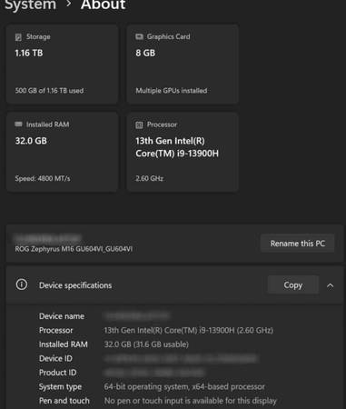 Selling my ASUS ROG Zephyrus M16 GU604VI 16 inch 2560 x 1600 , 240hz LED screen Intel i9 - 13900H processor 32gb RAM RTX 4070 graphics card 8GB VRAM 1TB SSD Win 11 Home 64 Bit Almost Brand New...