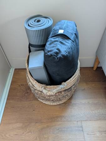 Yoga Sets (x3) with basket β Each includes 2 yoga blocks, bolster pillow, thick yoga mat, wicker basket.