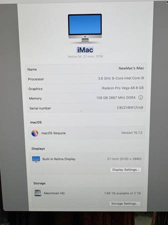 Mac 5k 27" 2TB SSD 128RAM 3.6 Ghz 8 Core i9 2019. Just did a fresh install of Sequoia Apple Wireless Keyboard and New LogiTech Bluetooth M330mouse. Clean $800 or best offer
