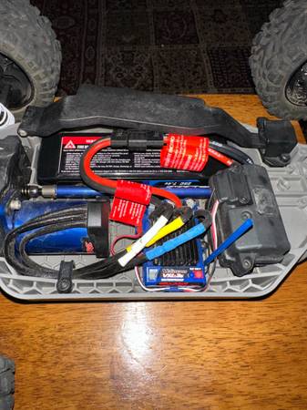 traxxas rustler 4x4 vxl RC Truck. THE ONLY ISSUE IS THAT ONE OF THE SHOCKS IS MISSING A PART WHICH MAKES THE CAR GO LOW TO THE GROUND. CHECK LAST TWO PICTURES SO YOU CAN SEE. EVERYTHING ELSE WORKS GREAT! Comes with everything you see on the pictures. Comes with battery and remote. No charger included. Check all photos for condition.(FIRM PRICE) IF INTERESTED TEXT ME AT show contact info