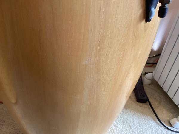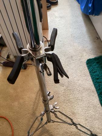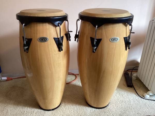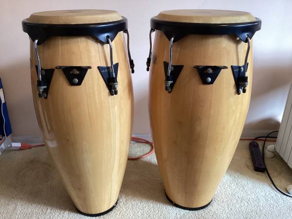 Also included are two LP Padded Conga Bags with grab handles, shoulder straps, tuning wrench, velcro storage pockets, in very good condition. The drums sound great and have a few minor scrapes. Some of the rubber stripping on the stand is worn as indicated in the photo.