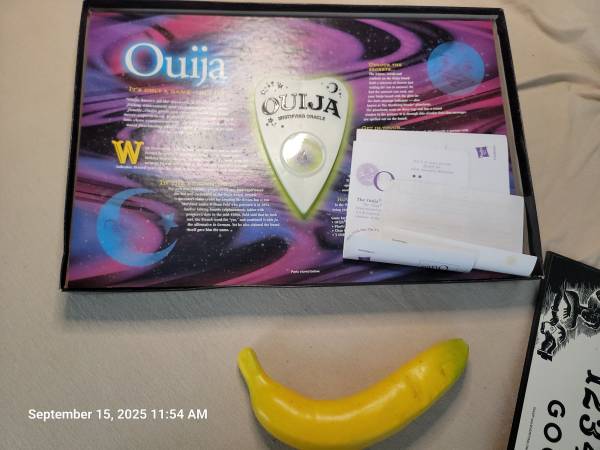 Vintage Parker Brothers Ouija board game with glow-in-the-dark lettering and planchette. Box shows some wear but overall intact. Great collectible or spooky party piece. Banana for scale.