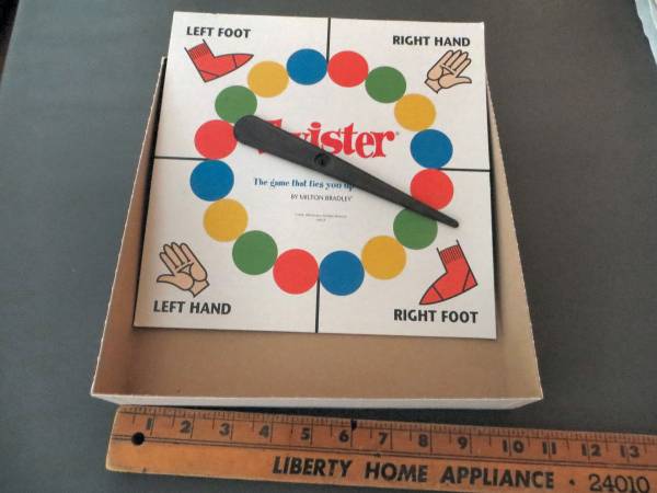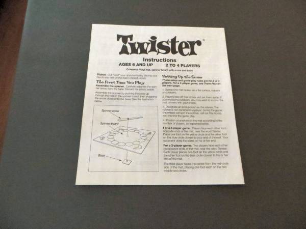 Twister game by Milton Bradley, Hasbro company, 2002 version. It is used but in like new condition, with original instructions. The box is in very good condition, one side is a little faded because it was facing the sun on my shelf. A fun game to play! No taxes or shipping charges which is a plus today! Smoke free environment!