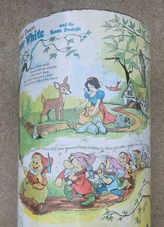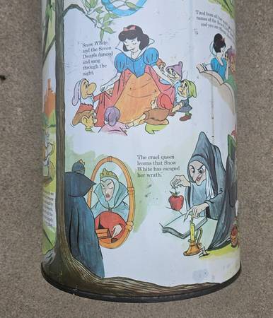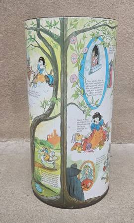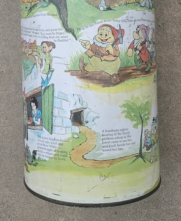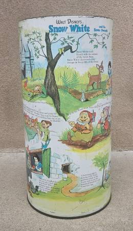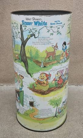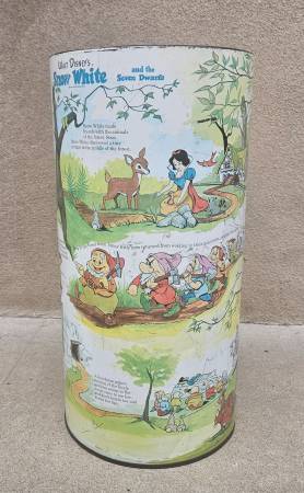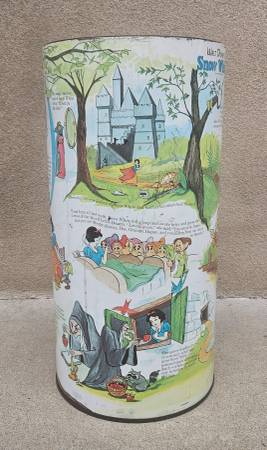 As the pictures show, this vintage 1970s Walt Disney Snow White trash can is in good condition. It is used and shows some wear, but overall it looks really good. It is 19 inches tall and 12 inches wide. It has some minor rust on the inside, but it is not rusted out, and it should last you for years and years. It displays nicely, and since it is a large trash , it looks very distinctive and stands out in any room it is displayed in.