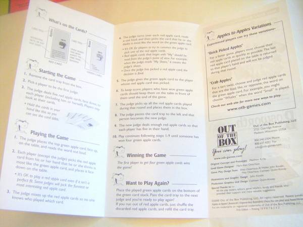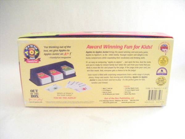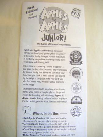 "Apples to Apples Junior!" brings the award winning card and party game, Apples to Apples, to the entire family. Younger readers will delight in the funny comparisons while expanding their vocabulary and thinking skills....just deal the cards and you're ready for instant family fun."-- from the back of the box.