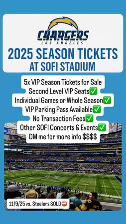 Los Angeles Chargers Season Tickets. I am selling five (5) VIP seats in Section C249, Row 9, seats 5-9 and two (2) VIP Parking Passes for the 2025-2026 NFL season. These are great upgraded seats located in the state-of-the-art SoFi Stadium in Inglewood. The tickets will be available to e-transfer through Ticketmaster from the Chargers directly to your account.
