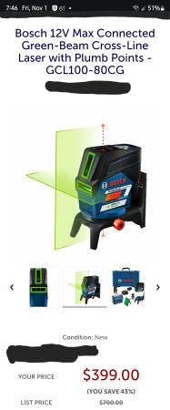 If you want to buy BRAND NEW Bosch LASER LEVEL text me. it is combination level cross and plumb, green line. show contact info