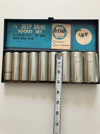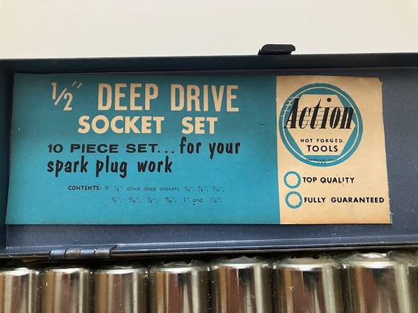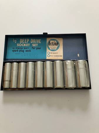Action brand 1/2" Deep Drive SAE Socket Set. 10 piece set for spark plug work. Sockets are 12 point, 3" in length and chrome. The nine (9) socket sizes are: 9/16", 5/8" 11/16", 3/4", 13/16", 7/8", 15/16", 1", 1/18". The sockets are contained in a metal box. The set is unused and the sockets are under plastic packaging. $45.00