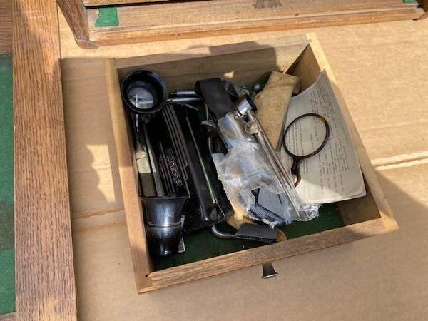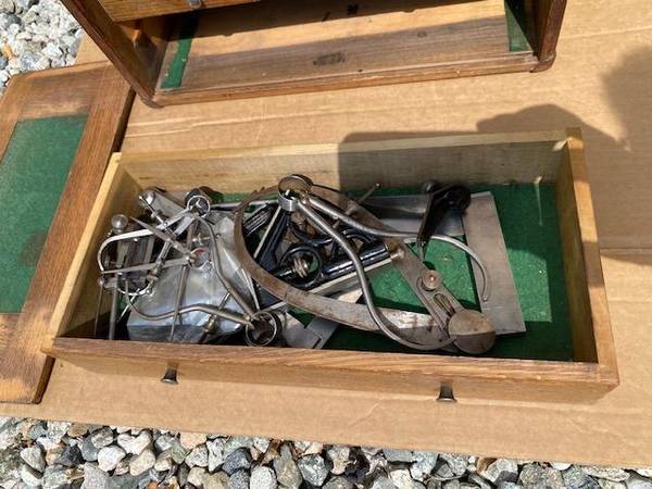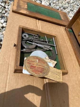 Tools include (2) Starrett Micrometers in original wood factory boxes plus numerous calipers, compasses, radius, bench level (on original box), Gauges, metall ruler, Jewelers loupes, magnifying glass, Starrett Key Seat Rule Clamps, and more