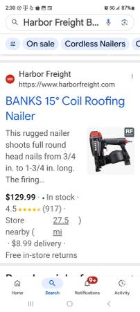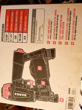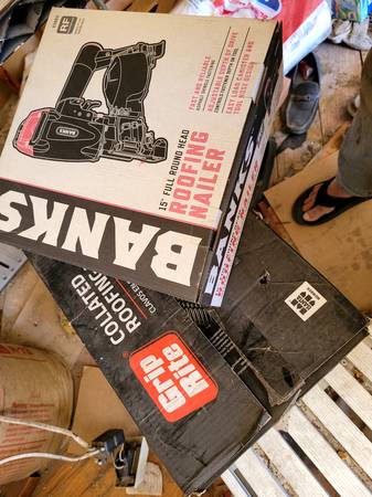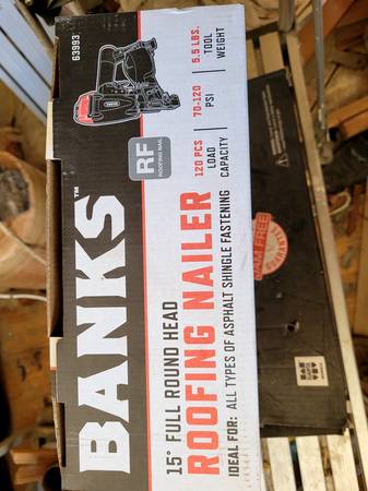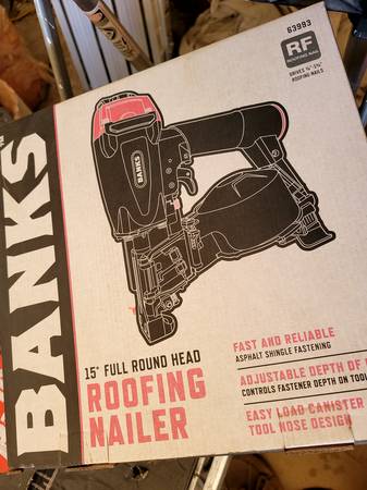BANKS Pneumatic Roofing Nailer .. and ½ box of new nails .. It's New I Nailed one side of a garage with it and have no other use for it .. $140.. Please Call Mike . 3l0-29l-3323