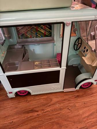 Selling an adorable Our Generation Food Truck with tons of detail! Perfect for 18-inch dolls like OG and American Girl. Has sink, counter, pretend food compartments, steering wheel, and lots of realistic details. Clean and in good working condition.