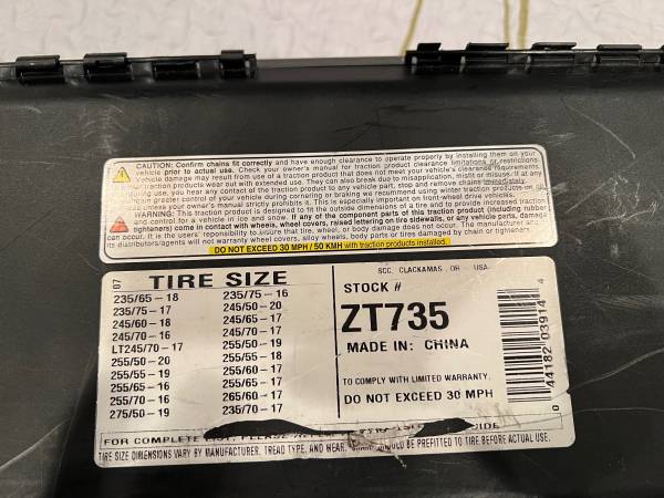 New SCC ZT735 Super Z LT Light Truck and SUV Tire Traction Chain. Fits the following sizes: 235/65 - 18 235/75 - 16 235/75-17 245/50 - 20 245/60 - 18 245/65-17 245/70-16 245/70-17 LT245/70 - 17...