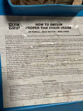 Navigate the snowy mountains with this dependable set of tire chains. See pic for all tire sizes that the chains fit. In good shape. $50. Mid City LA near Fairfax and Pico Streets. Contact...