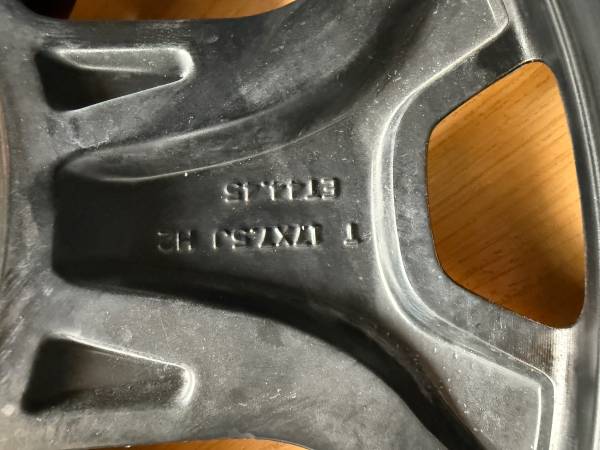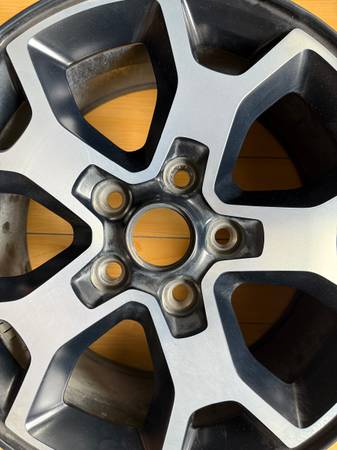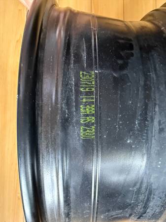 I have one black aluminum alloy Rim 17x7.5J that was used as a spare tire on my jeep. Never used on the road. Excellent condition. For more specs on this rim, see pics.