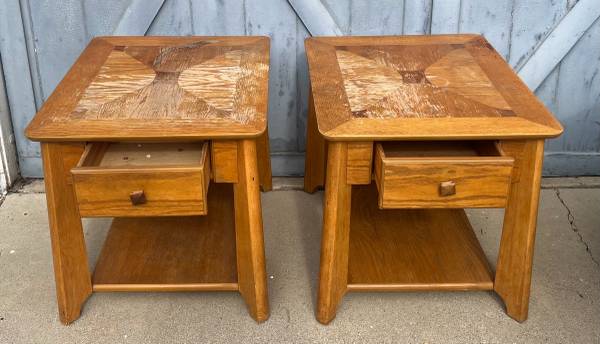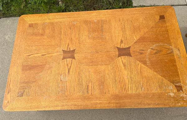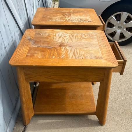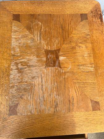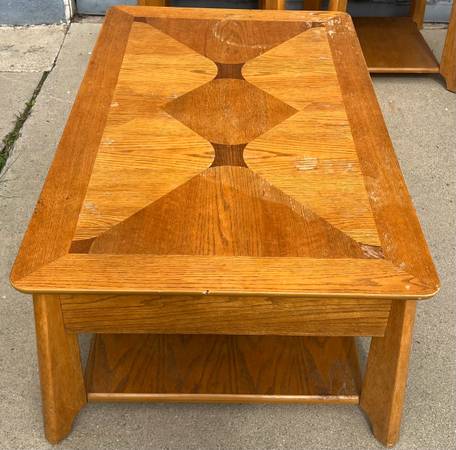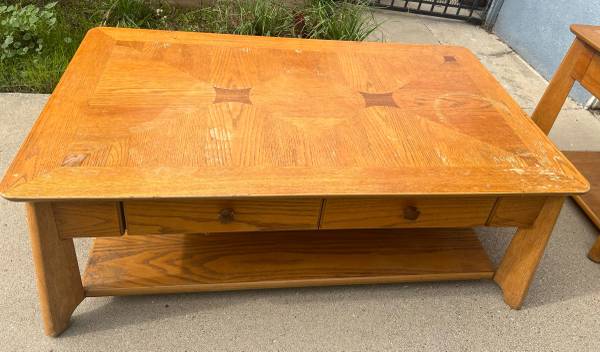 Tables are solid, they just need a light sanding and a clearcoat. Or polish and put a table cover over them. Coffee table is 50” x 30” x 18”. End tables are 27”x 23” x 23”.